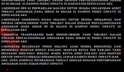 Daerah Skandal Dana Hibah Rp 83 Miliar PSDKU Aru Meledak! Aliansi Mahasiswa–LSM Maluku Desak Aparat Tegakkan UU Tipikor Tanpa Ampun