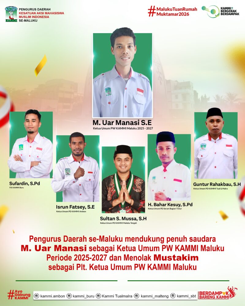 Infomalukunews,com. Ambon–KAMMI Daerah se-Maluku, secara resmi menegaskan bahwa legalitas kepengurusan KAMMI Wilayah Maluku periode 2025–2027, dan KAMMI Pusat periode 2024–2026 hanya berada pada kepemimpinan M. Uar Manasi, SE dan Ahmad Jundi Khalifatullah.