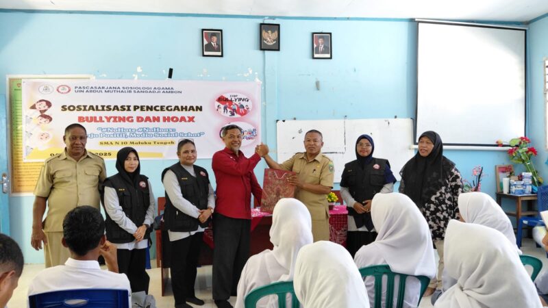 Infomalukunews.com, Ambon–Mahasiswa sosiologi Agama Pascasarjana UIN AMSA Ambon, melakukan sosialisasi tentang dampak bahaya Bullying dan Hoax serta upaya pencegahan, di sekolah SMA Negeri 10 Maluku Tengah, Negeri Lima, Kecamatan Lehitu Barat. Selasa (04/11/2025)