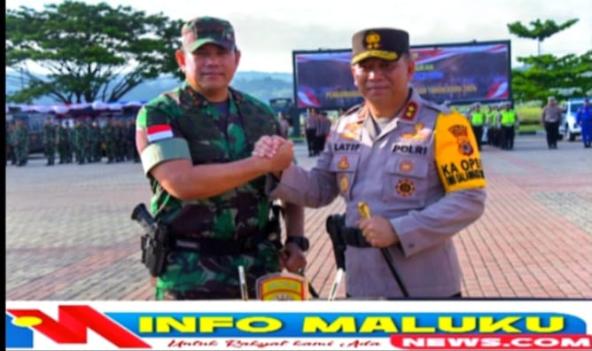 IM-Ambon;–Pangdam XVI/Pattimura Mayjen TNI Syafrial, PSC., M.Tr.(Han)., mendampingi Kapolda Maluku Irjen. Pol Lotharia Latif, S.H., M.Hum., mempimpin Apel gelar pasukan Operasi Lilin Salawaku, dalam rangka pengamanan Natal 2023 dan Tahun Baru 2024, di Lapangan Tahapary Polda Maluku, Tantui, Ambon, Kamis (21/12/2023).