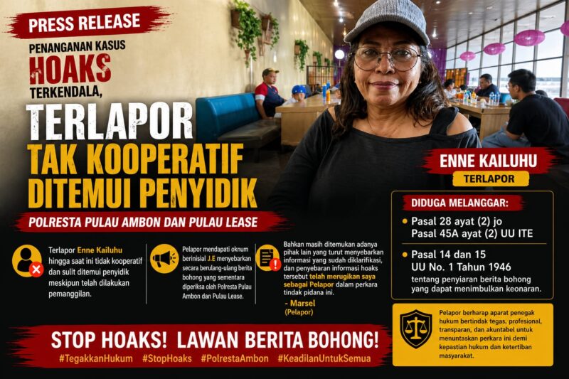 Infomalukunews.com, Ambon, 27 April 2026 — Proses penanganan dugaan tindak pidana penyebaran berita bohong (hoaks) yang tengah ditangani oleh Penyidik Polresta Pulau Ambon dan Pulau-Pulau Lease dilaporkan mengalami kendala. Hal ini disebabkan karena terlapor, Enne Kailuhu, hingga saat ini belum dapat ditemui dan dinilai tidak kooperatif dalam memenuhi panggilan penyidik.