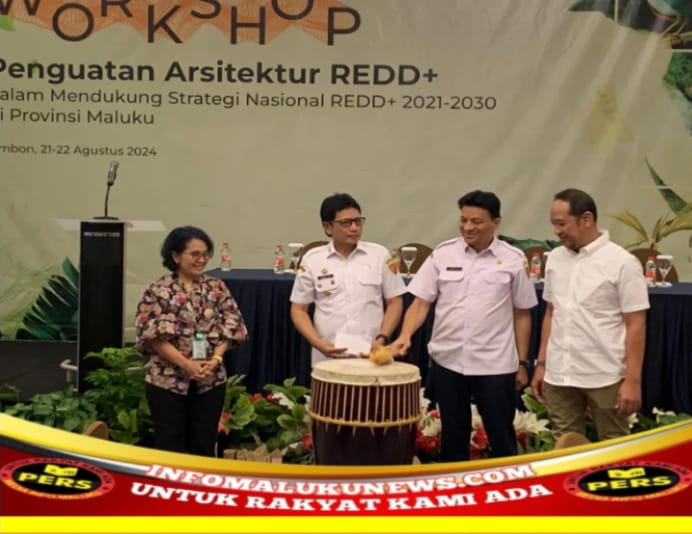 INFOMALUKUNEWS.COM,AMBON,- Pj Gubernur Maluku Sadali Ie, buka Workshop Penguatan Arsitektur REDD+ (Reducing Emissions from Deforestation and Forest Degradation) yang ditandai dengan pemukulan tifa, pada Rabu, 21 Agustus 2024, di lantai 2 Hotel Swissbell Ambon