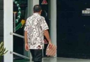 Ia terlihat mengenakan kemeja batik lengan pendek dipadukan dengan celana panjang hitam, sambil membawa sebuah map batik berwarna cokelat menuju lobi utama kantor kejaksaan.