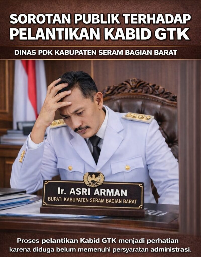 Infomalukunews.com, Seram Bagian Barat – Aroma skandal kembali menyelimuti Pemerintah Kabupaten Seram Bagian Barat (SBB). Bupati SBB, Ir. Asri Arman, diduga melantik Kepala Bidang (Kabid) Guru dan Tenaga Kependidikan (GTK) di Dinas Pendidikan yang belum memenuhi syarat, memicu gelombang kritik publik dengan Terbitnya Surat Keputusan (SK) Nomor: 800.1.3.3-140 Tahun 2026 tentang pengangkatan pejabat pengawas kini menjadi sorotan tajam dan memancing reaksi publik.jumat (17/4/2026).